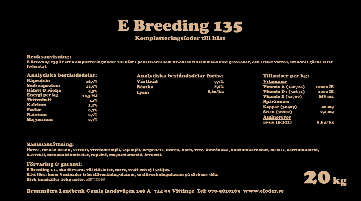 E Breeding 135. Ett foder för avel och unghästar. Är också ett perfekt foder för sätta hull och muskler. 20kg